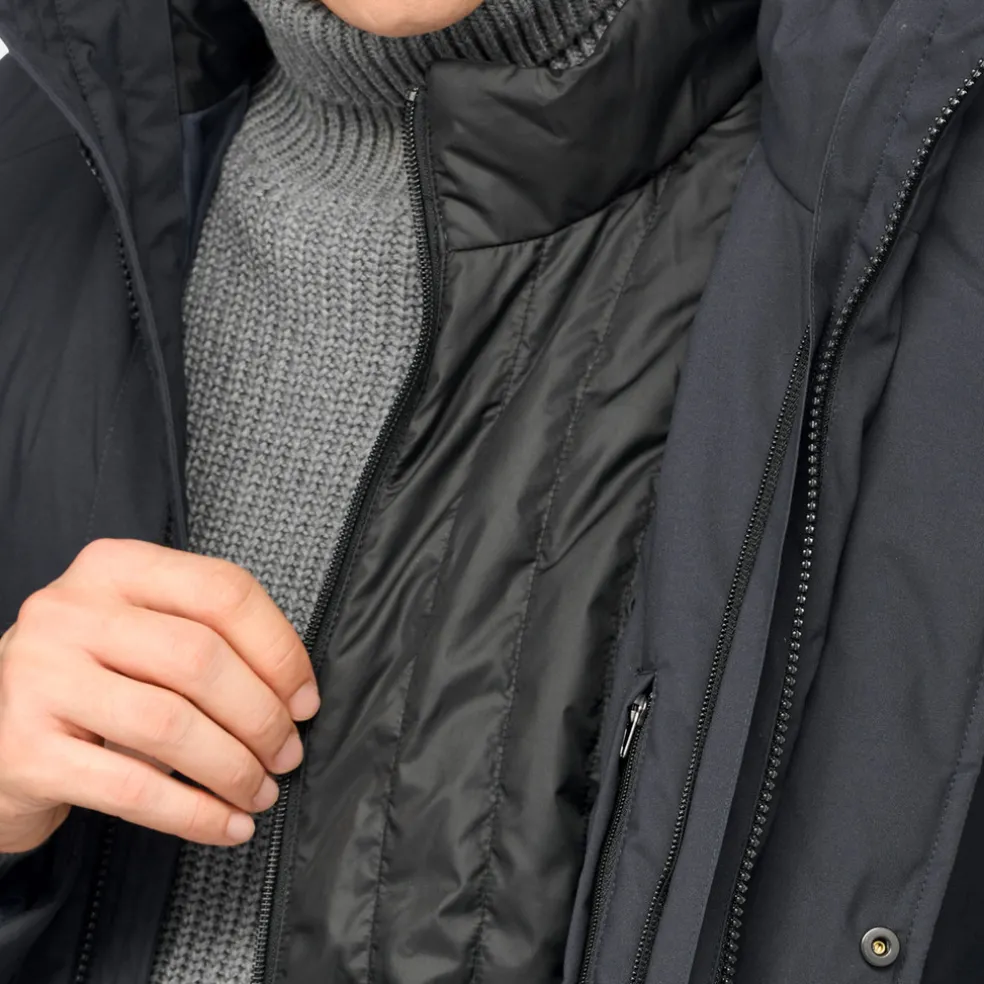 Blouson long pour homme à la coupe regular, fonctionnel et polyvalent, idéal pour une utilisation quotidienne. Décliné ici dans une sobre version bleu nuit, le modèle Andalo est doté d’une capuche pratique et d’un gilet intérieur, tous deux amovibles. Réalisé en polyester mat résistant à l’eau et coupe-vent, ce modèle présente un rembourrage en ouate recyclée chaude EcologicWARM.
