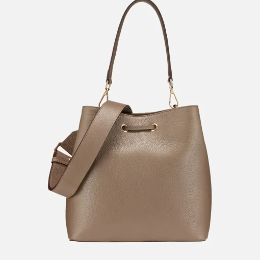Sac seau pratique pour femme au look moderne, pensé pour une utilisation quotidienne. Raffiné et essentiel dans cette tonalité taupe, ce modèle est réalisé en cuir foulonné souple et est idéal pour compléter les tenues décontractées chic. Doté d’une bandoulière réglable et d’une anse supérieure qui permet de le porter également sur l’épaule, le sac Andrenne est un compagnon citadin ultrapolyvalent.Modèle se portant à la main, à l’épaule ou en bandoulière.Fermeture par cordon coulissant et bouton magnétique.Anse amovible.Bandoulière réglable incluse à l’intérieur.Deux poches intérieures dont une à fermeture éclair.Porte-clés amovible.Accessoires métalliques à finition or.Dimensions : L 27 cm x l 18 cm x H 26 cm.