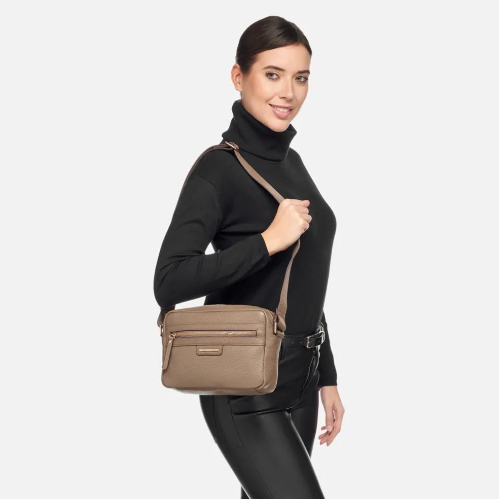 Sac à bandoulière pour femme, compact mais spacieux, parfait aussi bien pour la ville que pour les excursions extra-urbaines. Caractérisé par un design épuré et soigné dans les moindres détails, ce modèle est réalisé en cuir foulonné souple et proposé ici dans une tonalité taupe sophistiquée. Doté d’une bandoulière réglable et de deux poches extérieures pratiques, le modèle Blandine est un sac à bandoulière pratique pensé pour répondre aux exigences de la vie moderne.Modèle se portant en bandoulière.Fermeture éclair en métal.Bandoulière réglable.Poches avant et arrière avec fermeture éclair en métal.Deux poches intérieures dont une à fermeture éclair.Accessoires métalliques à finition or.Dimensions : L 25 cm x l 8 cm x H 16 cm.