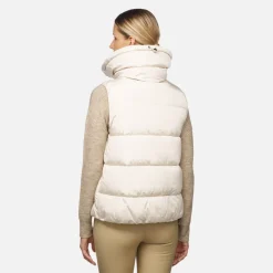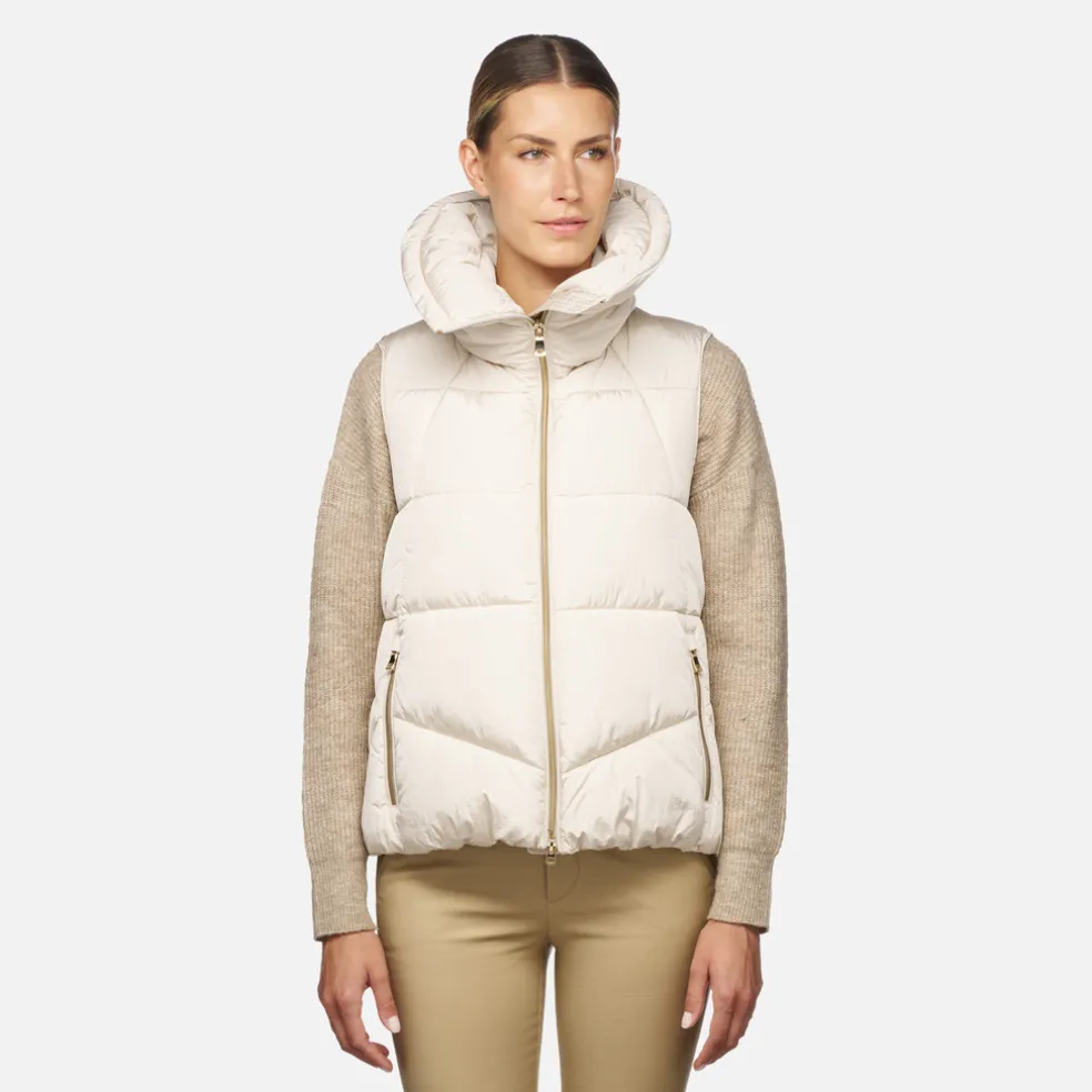 Doudoune sans manches pour femme à la coupe regular, féminine et à la saveur contemporaine. Proposé ici dans une version moderne blanc lait, le modèle Damiana est un gilet rembourré en ouate recyclée chaude EcologicWARM. Parfait pour les looks superposés, ce modèle est réalisé en tissu taffetas crinkle et complété par un col maxi enveloppant et protecteur.