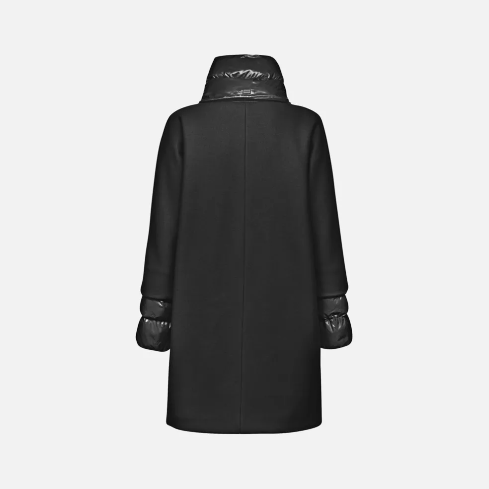 Manteau long pour femme à poches pratiques et fermeture invisible, au look urbain et moderne. Décliné ici dans une version noire, ce modèle est proposé en tissu à effet laine et rehaussé par des détails en nylon brillant sur le col et en bas des manches. Idéal pour accompagner les tenues citadines, le modèle Diamanta affiche un intérieur matelassé et rembourré en ouate recyclée EcologicWARM.