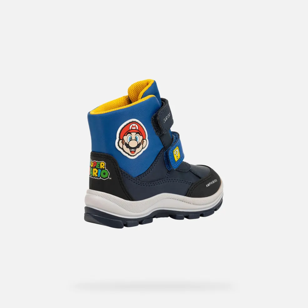 Bottines pour bébé imperméables et amorties, au design d’inspiration outdoor. Proposées ici en bleu marine et bleu roi, les Flanfil ABX présentent une tige vive ornée d’imprimés et d’applications dédiés à Super Mario. Nées de la collaboration entre Geox et Nintendo, ces chaussures sont réalisées en matière à effet cuir et nylon imprimé et gardent les petits pieds au chaud et toujours au sec, même sous la pluie.