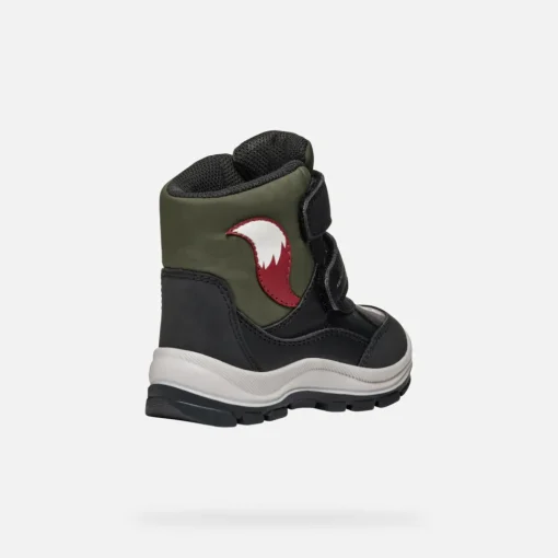 Bottines pour petit garçon imperméables et amorties, au design d’inspiration outdoor. Proposées ici en noir et vert foncé, ces chaussures présentent une tige vive ornée de tendres applications sur les côtés et sur le bout. Réalisées en matière à effet cuir et nylon, les Flanfil ABX garantissent des petits pieds toujours au sec, même sous la pluie.