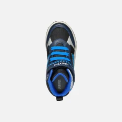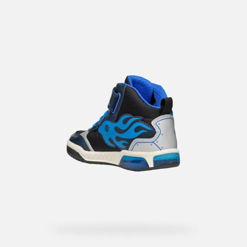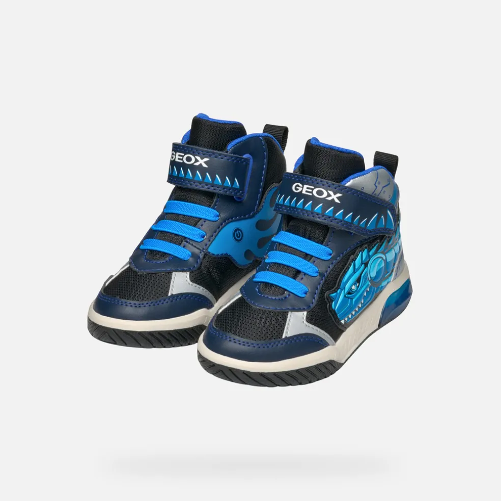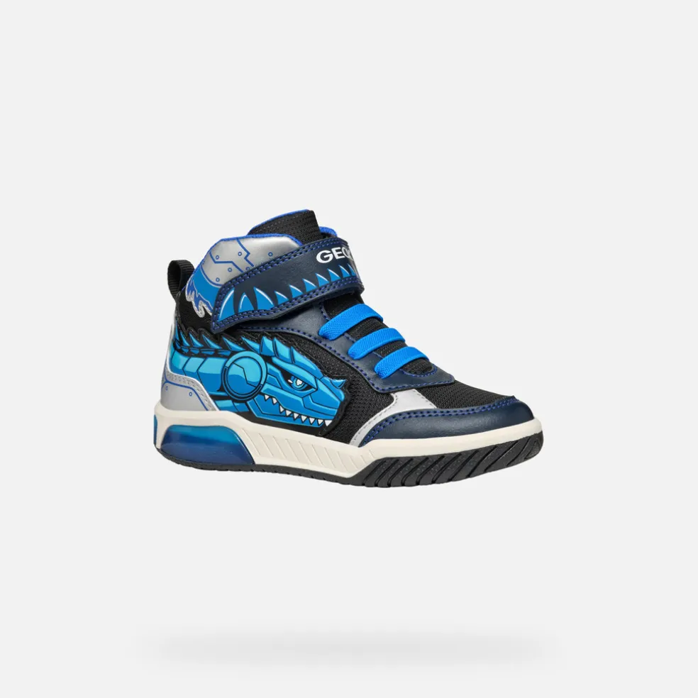 Sneakers semi-montantes pour garçon au style actif, avec lumières intégrées dans la semelle extérieure transparente. Dans cette version qui associe les tons bleu marine et turquoise, les Inek se font remarquer par les graphismes mordants présents sur leur tige, qui ajoutent une touche irrésistible à n’importe quel look sportif. Réalisé en tissu et matière à effet cuir imprimé, ce modèle confortable et respirant a été créé pour amuser votre enfant à chaque pas.