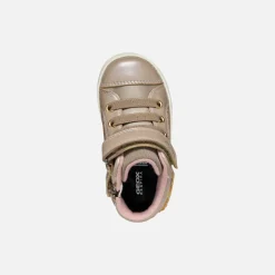 Sneakers semi-montantes pour petite fille décontractées au charme contemporain, parfaites pour accompagner les minilooks citadins de votre enfant. La tige beige foncé de ce modèle présente une tendre application latérale, pour égayer chaque pas de votre enfant. Réalisées en cuir velours souple et matière à effet cuir nacré, les Kilwi offrent confort et respiration optimale.