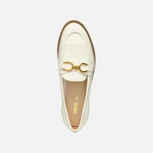 Mocassins pour femme à l’esthétique urbaine et dynamique, qui offrent confort et respirabilité tout au long de la journée. Réalisées en cuir nappa souple et rehaussées par des franges et une maxi boucle, ces chaussures sont proposées ici dans une lumineuse tonalité blanc lait. Ornées d’un détail métallique, les Prometya ajoutent une note contemporaine aux tenues citadines.