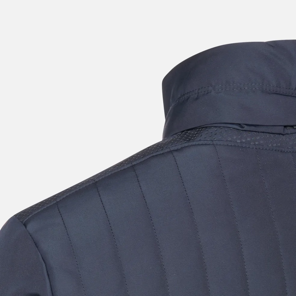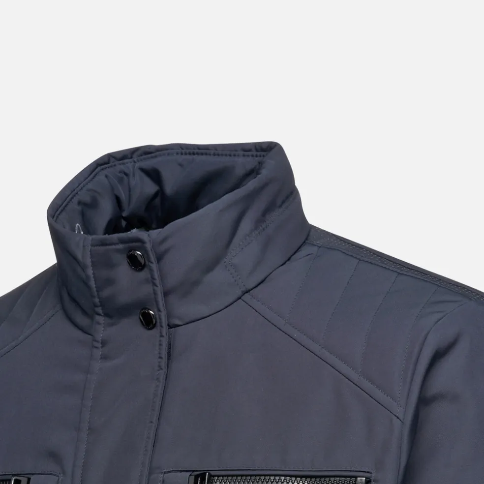 Blouson mi-long pour homme avec capuche dans le col, au style urbain. Réalisé en tissu Oxford épais, déperlant et coupe-vent, ce modèle est proposé ici dans une intense variante bleu nuit. Parfait pour compléter les looks citadins et du bureau, ce modèle est un pardessus pratique et fonctionnel revisité de manière urbaine.