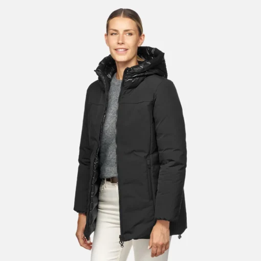 Veste pour femme réversible à la saveur contemporaine, idéale même pour les mois les plus froids. Proposé en version total black, ce modèle présente une face extérieure lisse en tissu taffetas et une face intérieure et une capuche de protection en nylon brillant laqué. Chaud et respirant, le modèle Spherica™ est un vêtement respirant parfait pour la ville, qui assure un confort maximal même en cas de mauvais temps.