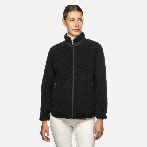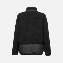 Sweat-shirt pour femme à fermeture éclair et petit col, chaud, respirant et confortable. Dans cette variante noire polyvalente, ce modèle présente des poches latérales pratiques à fermeture éclair. Parfait aussi bien pour les loisirs que pour accompagner les looks décontractés du quotidien, ce modèle est réalisé en tissu recyclé doux à effet teddy.