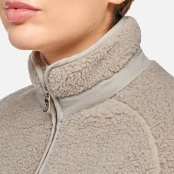Sweat-shirt pour femme à fermeture éclair et petit col, chaud, respirant et confortable. Dans cette variante tourterelle sophistiquée, ce modèle présente des poches latérales pratiques à fermeture éclair. Parfait aussi bien pour les loisirs que pour accompagner les looks décontractés du quotidien, ce modèle est réalisé en tissu recyclé doux à effet teddy.