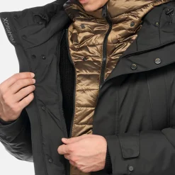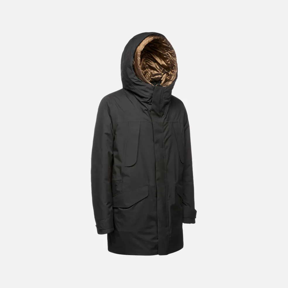 Parka longue pour homme à l’esthétique outdoor, gage de protection et d’imperméabilité même sous la pluie battante. Proposé ici dans une version noire, Terreste est un manteau indispensable dans la garde-robe de la saison la plus froide, parfait pour la vie en ville et les loisirs. Réalisé en twill de polyester léger recyclé à double couche, ce modèle bénéficie d’un plastron intérieur amovible en nylon brillant et d’un rembourrage chaud en ouate recyclée.