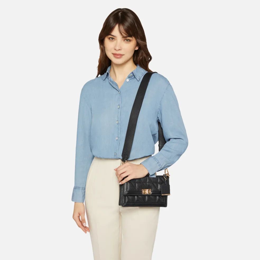 Sac à bandoulière pour femme au design contemporain et au style glamour et ultraféminin. Proposé ici dans une version noire sophistiquée, ce modèle est réalisé en cuir foulonné et est rehaussé par une finition matelassée géométrique qui sort du lot. Pratique et élégant à la fois, le sac Veriana est parfait pour les looks à porter de jour comme de nuit et peut aussi être porté comme une pochette grâce à sa bandoulière amovible.Se porte en bandoulière ou à la main, comme une pochette.Fermeture avec patte et fermoir en métal.Bandoulière réglable et amovible.Deux poches intérieures.Porte-clés amovible avec plaquette en cuir. Accessoires métalliques à finition or.Dimensions : L 22 cm x l 4,5 cm x H 14 cm.