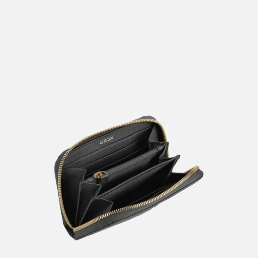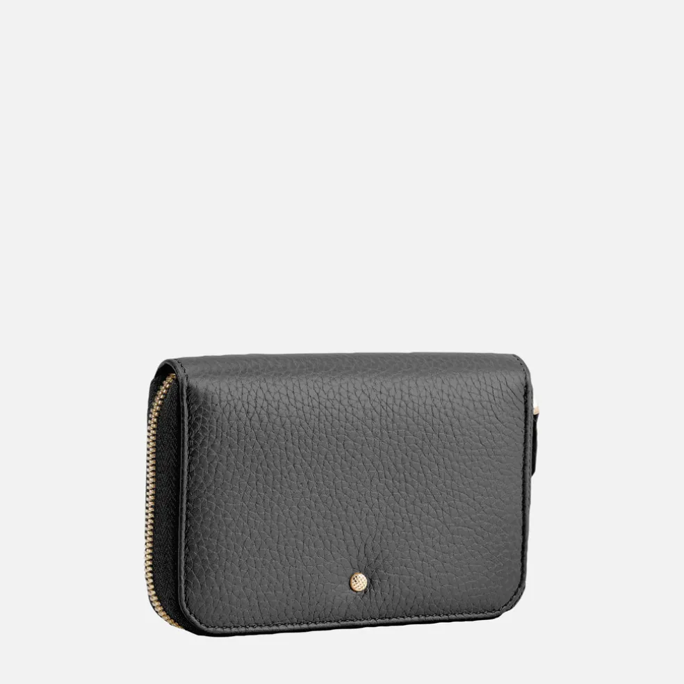 Portefeuille moyen pratique pour femme à soufflet et fermeture éclair, compagnon parfait de la vie de tous les jours. Réalisé en cuir foulonné souple et résistant dans une tonalité noire polyvalente et essentielle, ce modèle est caractérisé par un petit clou moleté décoratif. Compact mais de capacité généreuse, ce modèle permet une organisation optimale de vos cartes, billets, pièces et documents, pour emmener l’indispensable partout avec vous.Curseur de fermeture éclair en cuir.Six fentes porte-cartes intérieures des deux côtés.Séparateur pour billets.Porte-monnaie à fermeture éclair.Accessoires métalliques à finition or.Dimensions : L 15 cm x H 9,5 cm x Ép. 2,5 cm.