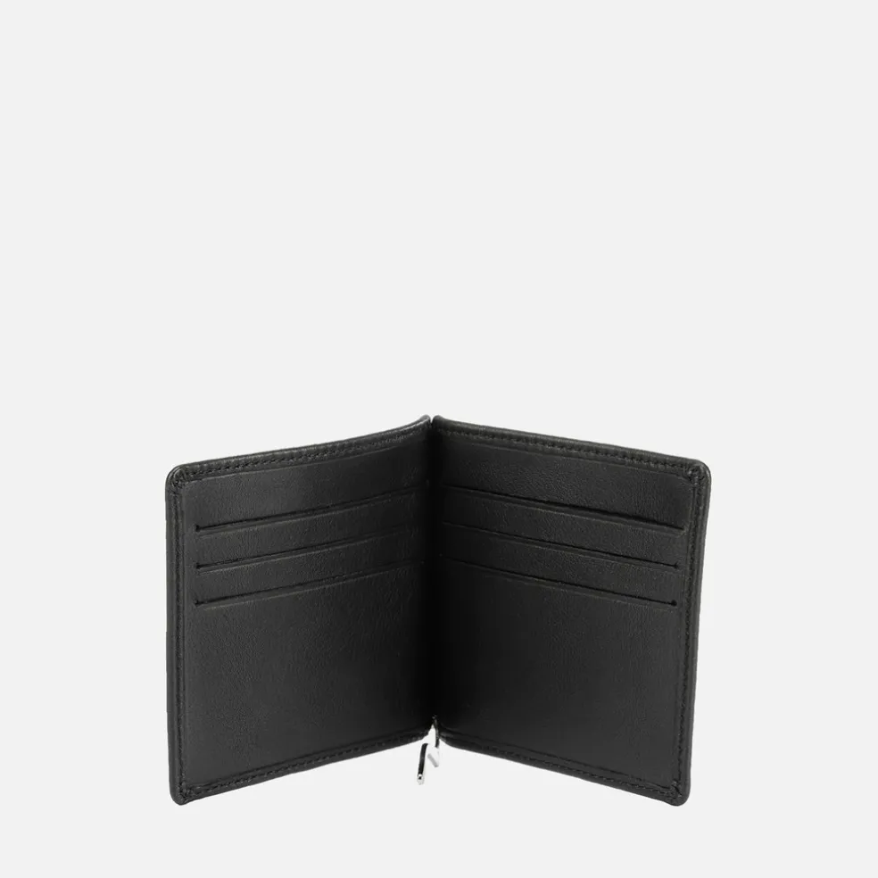 Portefeuille pour homme aux dimensions réduites et au look minimaliste, avec petit clou moleté décoratif. Réalisé en cuir foulonné, ce modèle affiche un style remis au goût du jour et indémodable dans cette variante noire. Doté d’une pince à billets en métal à l’intérieur, avec son design remis au goût du jour et fonctionnel, ce modèle est un accessoire parfait pour emporter tout le nécessaire avec soi.Six fentes porte-cartes intérieures des deux côtés.Détails métalliques à finition argent.Dimensions : L 10,5 cm x H 9 cm x Ép. 1 cm.