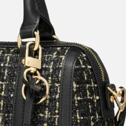 Sac polochon pour femme pratique au design indémodable et au style raffiné et féminin. Réalisé dans un élégant mélange de tissu bouclé et matière à effet cuir, ce modèle est proposé ici dans une version sophistiquée qui associe les coloris noir et or. Parfait pour la vie en ville et adapté du bureau à l’apéritif, le modèle Zene S est doté d’une bandoulière amovible, d’une anse double et d’une fermeture éclair métallique.Modèle se portant à la main, à l’épaule ou en bandoulière.Fermeture éclair en métal.Bandoulière réglable avec boucle.Anse double.Deux poches intérieures dont une à fermeture éclair.Porte-clés amovible avec plaquette en cuir.Accessoires métalliques à finition or.Dimensions : L 24 cm x l 15 cm x H 22 cm.