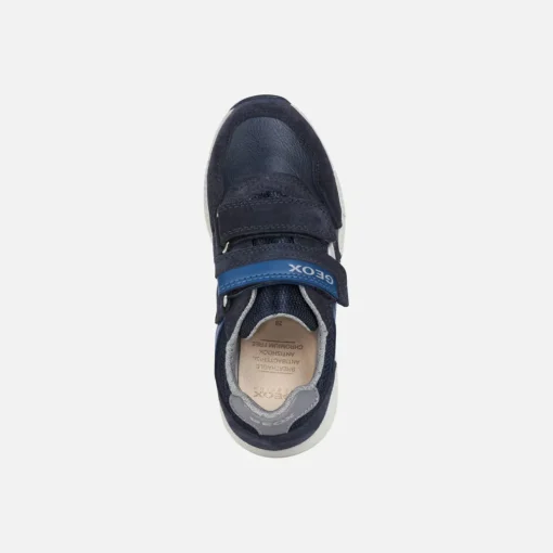 Baskets pour garçon au style actif, assurant respirabilité et confort.Les Alben présentent une alternance de cuir velours et matière à effet cuir et se distinguent par un irrésistible style rétro d’inspiration running. Déclinées ici dans les tons bleu marine et rehaussées par des détails bleu aviateur foncé, ces baskets présentent une semelle extérieure respirante de couleur contrastée et des scratch pratiques, qui les rendent parfaites pour une utilisation polyvalente et quotidienne.