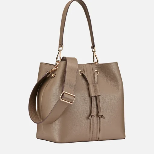 Sac seau pratique pour femme au look moderne, pensé pour une utilisation quotidienne. Raffiné et essentiel dans cette tonalité taupe, ce modèle est réalisé en cuir foulonné souple et est idéal pour compléter les tenues décontractées chic. Doté d’une bandoulière réglable et d’une anse supérieure qui permet de le porter également sur l’épaule, le sac Andrenne est un compagnon citadin ultrapolyvalent.Modèle se portant à la main, à l’épaule ou en bandoulière.Fermeture par cordon coulissant et bouton magnétique.Anse amovible.Bandoulière réglable incluse à l’intérieur.Deux poches intérieures dont une à fermeture éclair.Porte-clés amovible.Accessoires métalliques à finition or.Dimensions : L 27 cm x l 18 cm x H 26 cm.