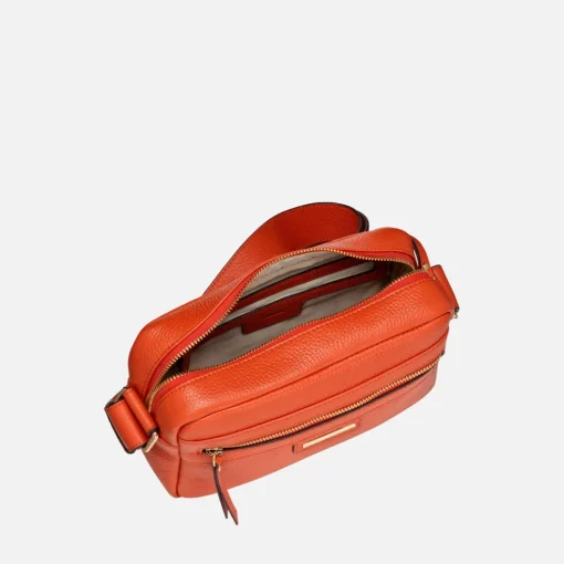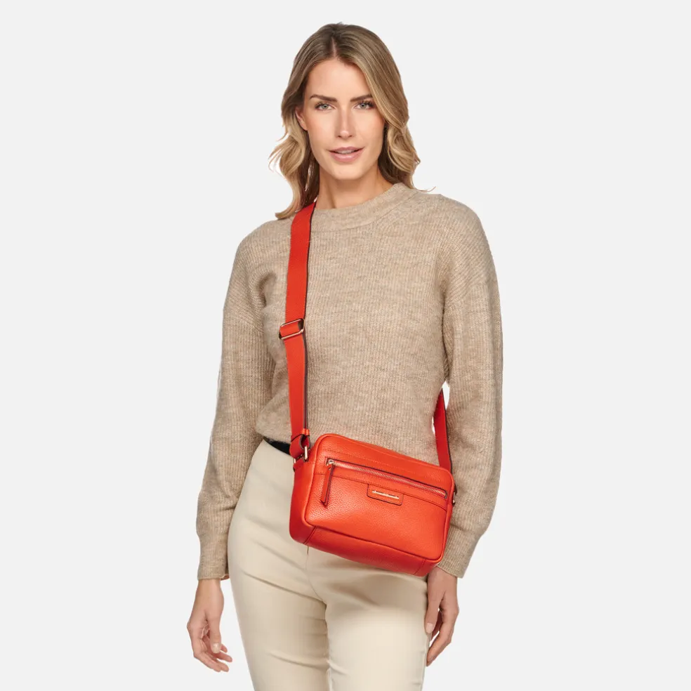 Sac à bandoulière pour femme, compact mais spacieux, parfait aussi bien pour la ville que pour les excursions extra-urbaines. Caractérisé par un design épuré et soigné dans les moindres détails, ce modèle est réalisé en cuir foulonné souple et proposé ici dans une tonalité orange qui sort du lot. Doté d’une bandoulière réglable et de deux poches extérieures pratiques, le modèle Blandine est un sac à bandoulière pratique pensé pour répondre aux exigences de la vie moderne.Modèle se portant en bandoulière.Fermeture éclair en métal.Bandoulière réglable.Poches avant et arrière avec fermeture éclair en métal.Deux poches intérieures dont une à fermeture éclair.Accessoires métalliques à finition or.Dimensions : L 25 cm x l 8 cm x H 16 cm.
