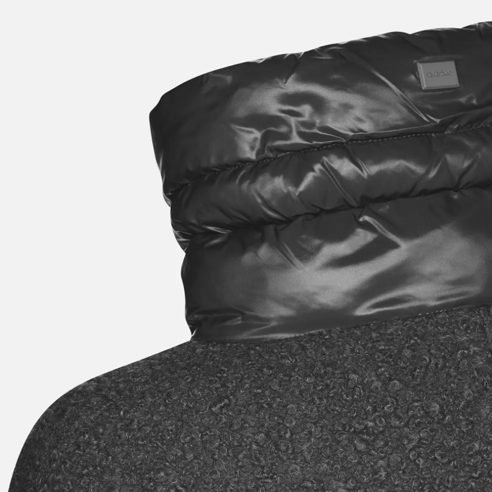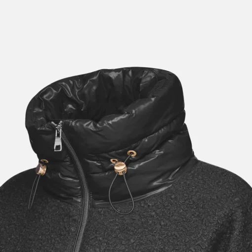 Manteau mi-long pour femme à la coupe oversize et au design moderne. Dans cette variante noire dotée de poches pratiques et d’un col enveloppant réglable par un cordon, ce modèle est réalisé en tissu bouclé avec des détails en nylon brillant laqué. Calithe est un manteau d’épaisseur moyenne, rehaussé par un intérieur matelassé avec un rembourrage en ouate recyclée EcologicWARM, idéal pour compléter les tenues décontractées chics.
