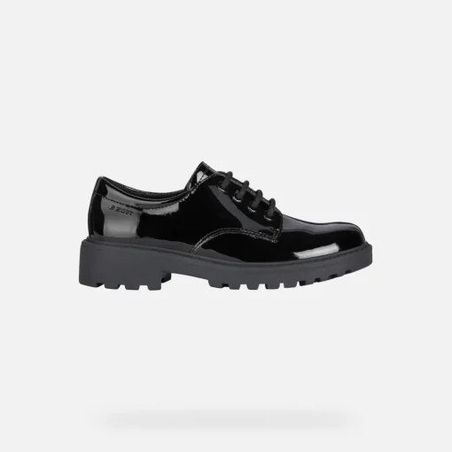 Chaussures pour fille confortables et respirantes, pour l’école ou les looks formels.Réalisées en matière à effet cuir verni et proposées dans une version total black, les Casey sont des chaussures derbies au style formel rehaussées par des détails Oxford, idéales à associer à l’uniforme scolaire ou pour compléter les tenues des grandes occasions.
