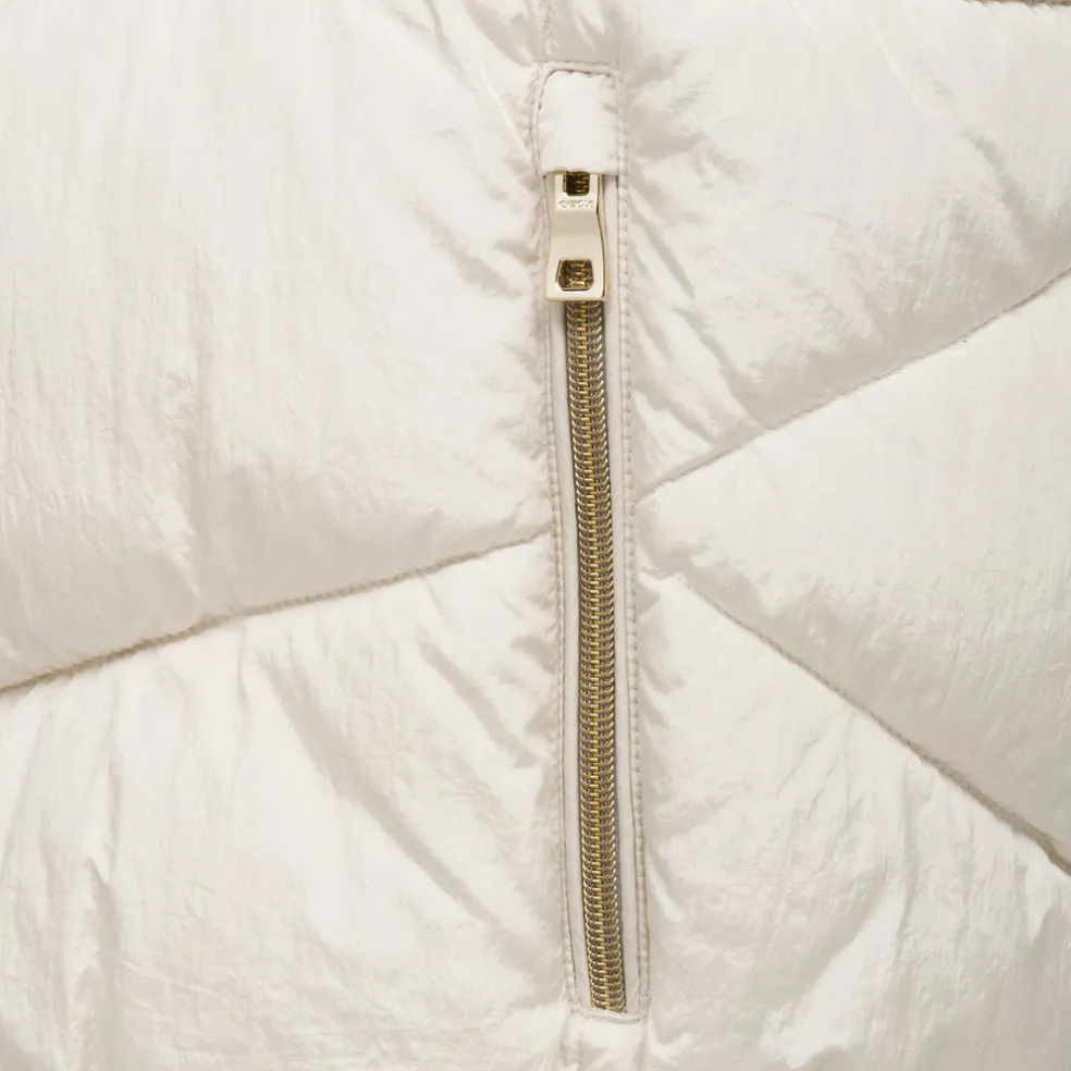 Doudoune sans manches pour femme à la coupe regular, féminine et à la saveur contemporaine. Proposé ici dans une version moderne blanc lait, le modèle Damiana est un gilet rembourré en ouate recyclée chaude EcologicWARM. Parfait pour les looks superposés, ce modèle est réalisé en tissu taffetas crinkle et complété par un col maxi enveloppant et protecteur.