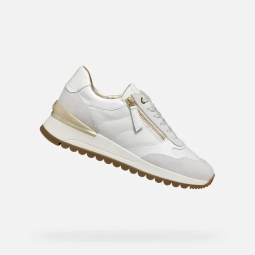 Sneakers pour femme à fermeture éclair latérale pratique, au style sportif mais raffiné. Réalisées dans une combinaison de cuir nappa souple et cuir velours, ces chaussures sont particulièrement polyvalentes dans cette variante qui associe le blanc et le blanc lait. Avec leur esthétique d’inspiration running, revisitée dans un style tendance et contemporain, les Desya donnent du caractère aux décontractées chics des moments de loisirs.