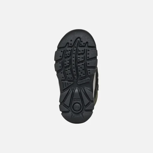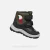 Bottines pour petit garçon imperméables et amorties, au design d’inspiration outdoor. Proposées ici en noir et vert foncé, ces chaussures présentent une tige vive ornée de tendres applications sur les côtés et sur le bout. Réalisées en matière à effet cuir et nylon, les Flanfil ABX garantissent des petits pieds toujours au sec, même sous la pluie.