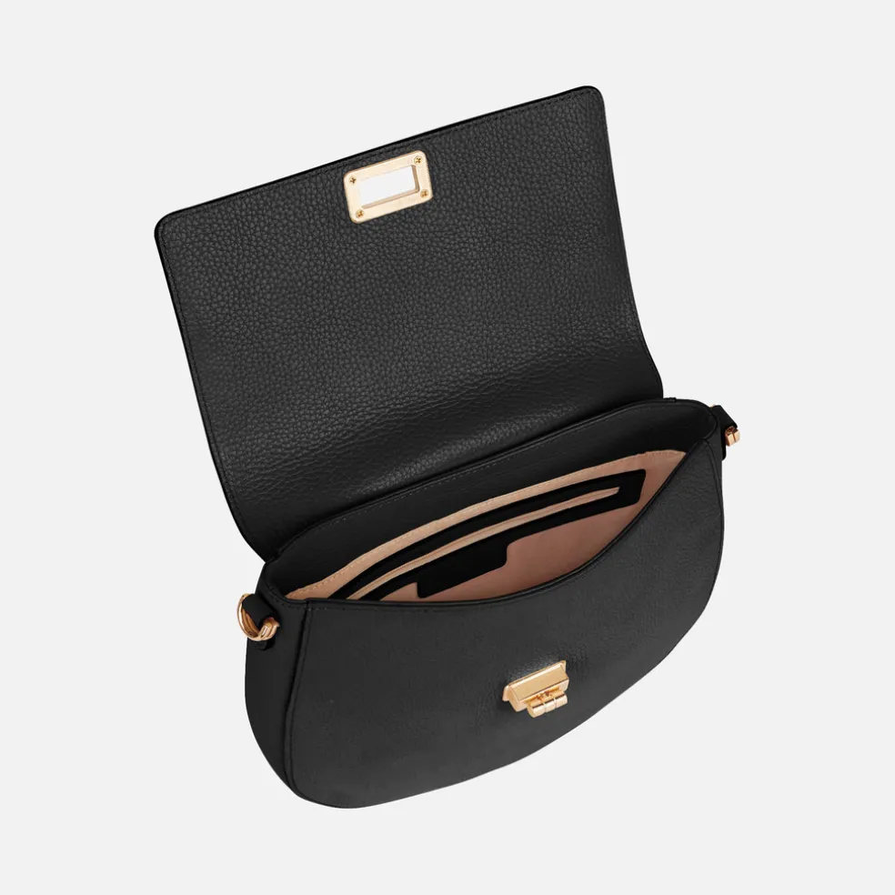 Sac cocktail femme, à forme arrondie, parfait pour un look à porter de jour comme de nuit. Flavie est un sac cocktail à forme arrondie et au charme vintage. Grâce à la double bandoulière fournie, il peut être porté sous le bras, à la main ou comme un crossbody décontracté et contemporain, en fonction des besoins et de la situation. Décliné en noir, il est fabriqué en cuir souple.Fermeture avec patte et fermoir moleté.Deux bandoulières amovibles, une plus courte et étroite, l’autre plus large et réglable.À l’intérieur : poche à fermeture éclair.Dimensions : L 25 cm x H 23 cm x W 5 cm