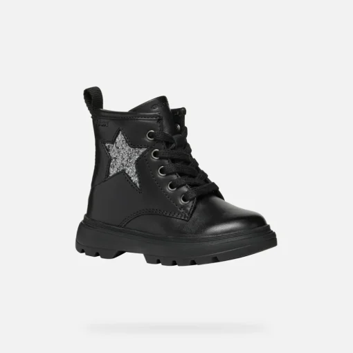 Bottines à lacets pour petite fille de style rangers dotées d’une confortable semelle extérieure chunky. Avec leur tige à la mode présentée ici en noir avec une application latérale brillante en forme d’étoile, les Kiddartah sont parfaites aussi bien pour accompagner les tenues décontractées que pour les occasions spéciales. Réalisées en cuir nappa souple et tissu à paillettes, ces chaussures sont confortables, légères et respirantes.