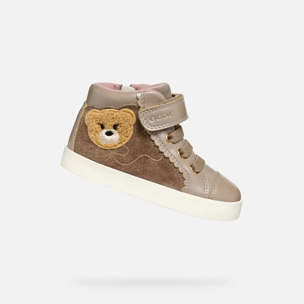 Sneakers semi-montantes pour petite fille décontractées au charme contemporain, parfaites pour accompagner les minilooks citadins de votre enfant. La tige beige foncé de ce modèle présente une tendre application latérale, pour égayer chaque pas de votre enfant. Réalisées en cuir velours souple et matière à effet cuir nacré, les Kilwi offrent confort et respiration optimale.