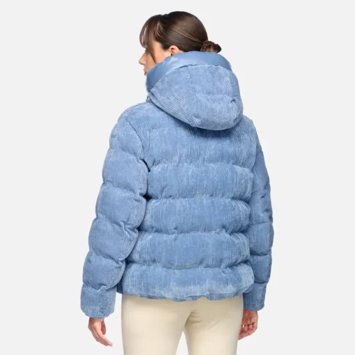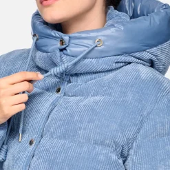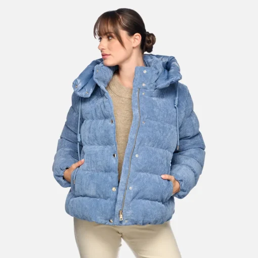 Parka courte matelassée pour femme, au design décontracté remis au goût du jour et à la coupe oversize. Décliné ici dans une irrésistible coloris bleu ciel, le modèle Loisia est un manteau pratique et fonctionnel qui complète avec désinvolture les associations informelles. Réalisé dans un velours côtelé doux et coupe-vent, ce modèle est doté d’une capuche réglable par un cordon et bordée de nylon brillant.