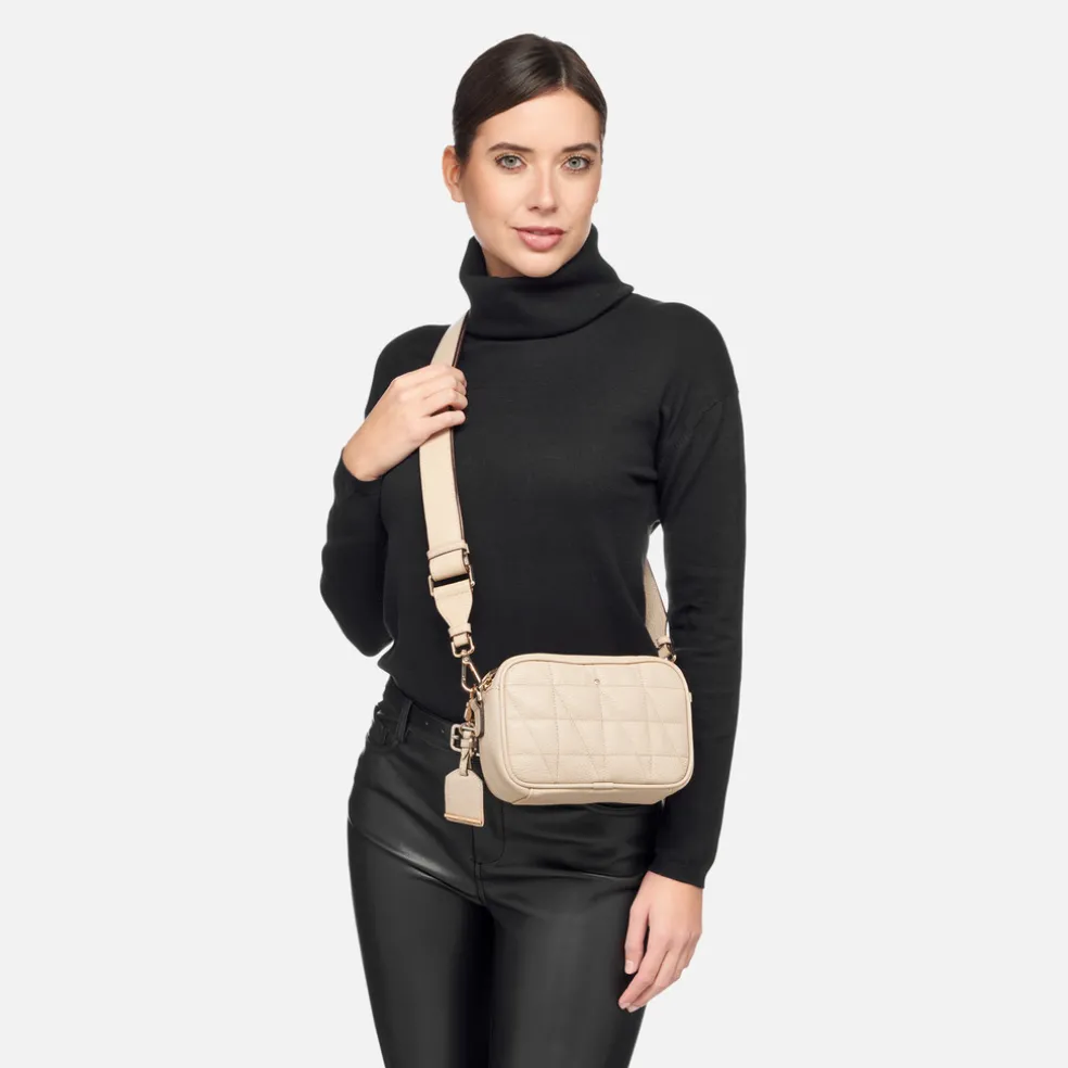 Sac à bandoulière pour femme pratique à l’ADN moderne, pensé pour traverser la ville les mains libres. Réalisé en cuir foulonné souple avec une finition matelassée spéciale, ce modèle est proposé ici dans une version blanc lait à l’allure féminine. Accessoire essentiel de la garde-robe quotidienne, le modèle Narcisia est compact et extrêmement fonctionnel et rehausse n’importe quel look avec une touche raffinée.Modèle se portant en bandoulière et à l’épaule.Fermeture éclair en métal.Bandoulière réglable et amovible.Deux poches intérieures.Porte-clés amovible avec plaquette en cuir.Accessoires métalliques à finition or.Dimensions : L 23 cm x l 6 cm x H 14 cm.