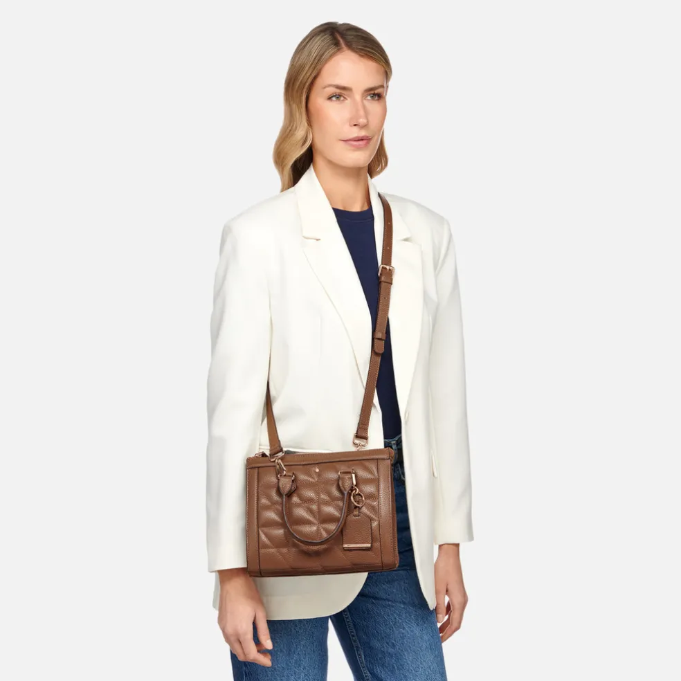 Sac cabas pour femme de taille moyenne, à l’esthétique contemporaine et à l’ADN citadin. Réalisé en cuir foulonné souple et rehaussé par une finition matelassée, ce modèle est présenté ici dans une tonalité brun argile chaude et polyvalente. Quotidien et ultraféminin à la fois, le modèle Olympiy est doté d’une anse double et d’une bandoulière pratique et est parfait du bureau aux loisirs.Modèle se portant à la main ou en bandoulière.Fermeture éclair en métal.Bandoulière réglable et amovible.Petit clou décoratif.Deux poches intérieures.Porte-clés amovible avec plaquette en cuir.Accessoires métalliques à finition or.Dimensions : L 24 cm x l 9 cm x H 21,5 cm.