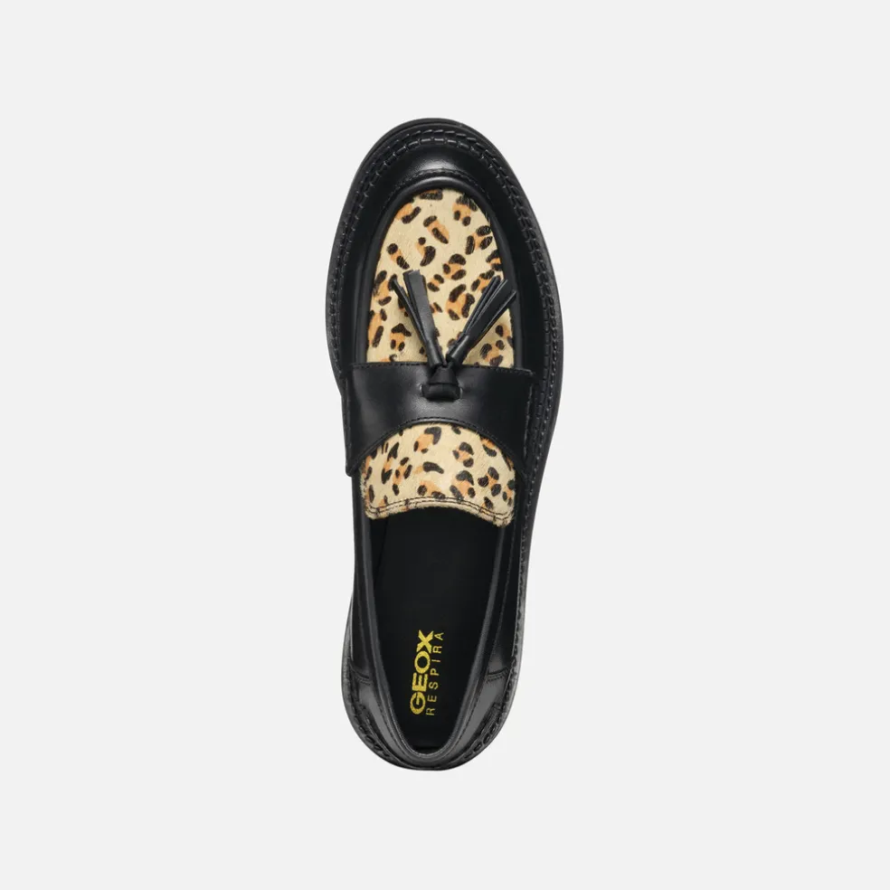 Mocassins pour femme à pampilles à la saveur recherchée et aux lignes modernes, qui offrent confort et respirabilité. Proposées dans une version particulière qui associe les coloris noir et cognac, ces chaussures possèdent une tige en cuir lisse rehaussée par un insert à effet poulain à imprimé animalier. Idéales pour la ville, les Serilda donnent une allure mordante aux tenues citadines de tous les jours.