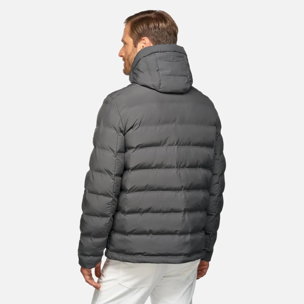 Parka courte pour homme au design d’inspiration sportive et au style moderne. Réalisé en tissu de polyester contrecollé et matelassé, ce modèle proposé ici dans un coloris anthracite est déperlant et coupe-vent. Respirant et ultraconfortable, ce vêtement dispose d’un rembourrage recyclé chaud et d’une capuche enveloppante pratique.