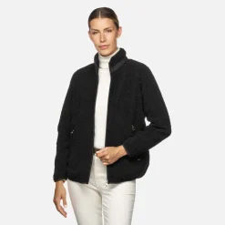 Sweat-shirt pour femme à fermeture éclair et petit col, chaud, respirant et confortable. Dans cette variante noire polyvalente, ce modèle présente des poches latérales pratiques à fermeture éclair. Parfait aussi bien pour les loisirs que pour accompagner les looks décontractés du quotidien, ce modèle est réalisé en tissu recyclé doux à effet teddy.