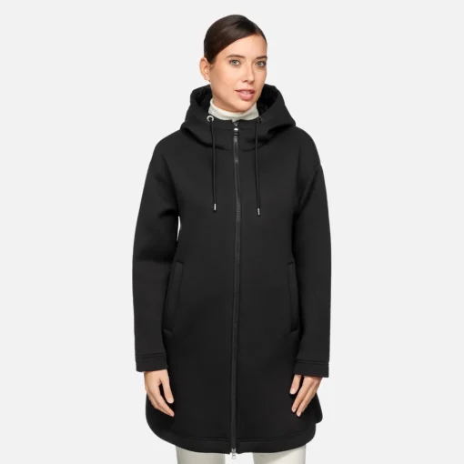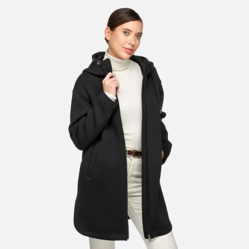 Sweat-shirt long pour femme au design tendance et moderne, parfait pour compléter les looks sportifs. Proposé ici en noir, ce modèle est doté d’une capuche enveloppante maxi réglable par un cordon. Réalisé en softshell à l’aspect mat, ce modèle est un gage de confort tout au long de la journée.