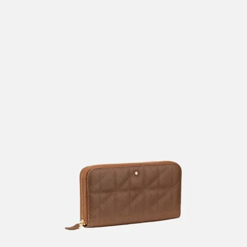 Grand portefeuille pour femme à soufflet et fermeture éclair, compagnon de la vie de tous les jours au style recherché. Ce modèle à la forme essentielle est réalisé en cuir foulonné à finition matelassée, proposé ici dans une tonalité taupe résolue mais raffinée. Doté de multiples fentes porte-cartes, d’un porte-monnaie à fermeture éclair et d’un séparateur de billets, ce modèle est spacieux et fonctionnel, et idéal également pour voyager.Fermeture éclair.Curseur de fermeture éclair en cuir.Petit clou moleté décoratif.Douze fentes porte-cartes intérieures des deux côtés.Séparateur pour billets.Porte-monnaie à fermeture éclair.Accessoires métalliques à finition or.Dimensions : L 20 cm x l 2 cm x H 11 cm.