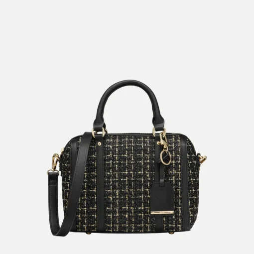 Sac polochon pour femme pratique au design indémodable et au style raffiné et féminin. Réalisé dans un élégant mélange de tissu bouclé et matière à effet cuir, ce modèle est proposé ici dans une version sophistiquée qui associe les coloris noir et or. Parfait pour la vie en ville et adapté du bureau à l’apéritif, le modèle Zene S est doté d’une bandoulière amovible, d’une anse double et d’une fermeture éclair métallique.Modèle se portant à la main, à l’épaule ou en bandoulière.Fermeture éclair en métal.Bandoulière réglable avec boucle.Anse double.Deux poches intérieures dont une à fermeture éclair.Porte-clés amovible avec plaquette en cuir.Accessoires métalliques à finition or.Dimensions : L 24 cm x l 15 cm x H 22 cm.